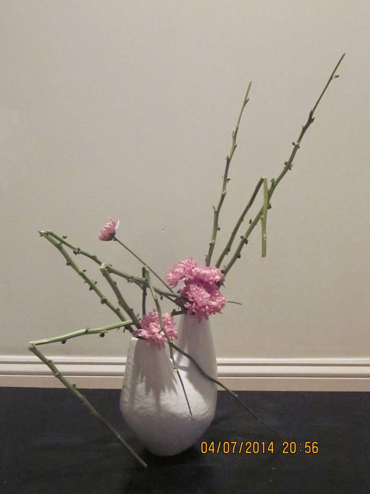 | Material: Japanese Quince, Mum, Pine and driftwood Container: Ceramic Suiban, made by my daughter |