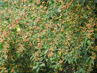 Driving on the roadside, there are many trees like Crab Apple, Crepe Myrtle and Cherry which have a lot of fruits or berries already. You can sense a bit of Autumn in the air now. Using seasonal materials as much as possible, with what you can get, is always one of Ikebana's main concepts.